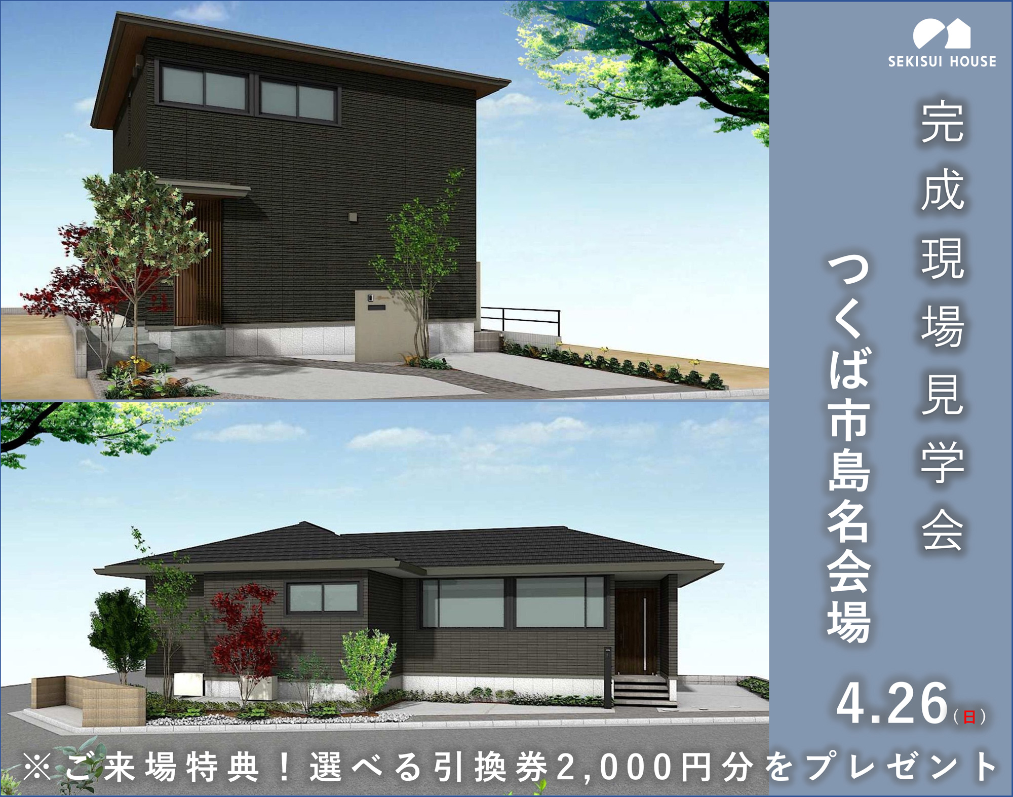タイプの異なる2棟を同時にご覧いただける完成現場見学会を開催いたします。